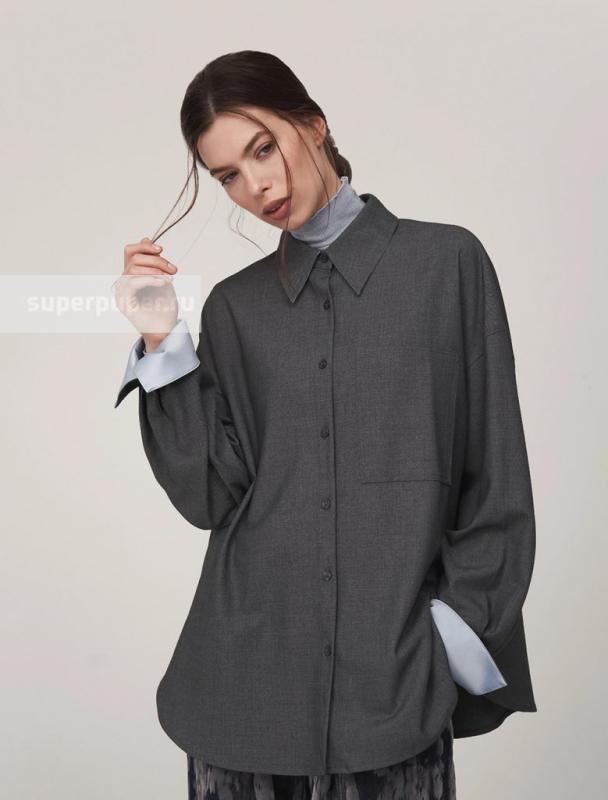 В: 100% Ацетатный шел Рубашка регулярного силуэта со спущенной линией плеча и отложным воротником. По передней части изделия планка с застежкой на пуговицы, с левой стороны — декоративный накладной карман. На изнанке воротника и манжет — шелковые контрастные вставки.