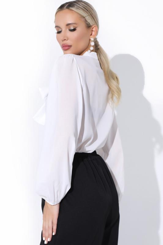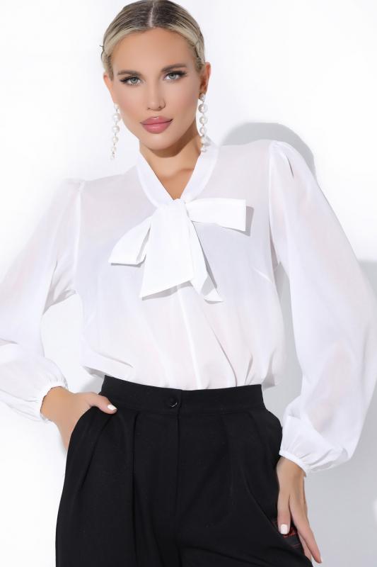 Романтичная блузка из шифона, свободного кроя. Рукав длинный, втачной, с резинкой по низу. Особую оригинальность этой блузке придает бант на горловине. Эту нарядную блузку можно комбинировать и с юбкой, и с брюками. Материал: креп-шифон Декоративные элементы: спереди бант Силуэт: прилегающий. Карманы: отсутствуют Тип горловины: округлый Длина изделия по спинке: 44р- 67 см, 46-50р-68 см, 52р-69 см