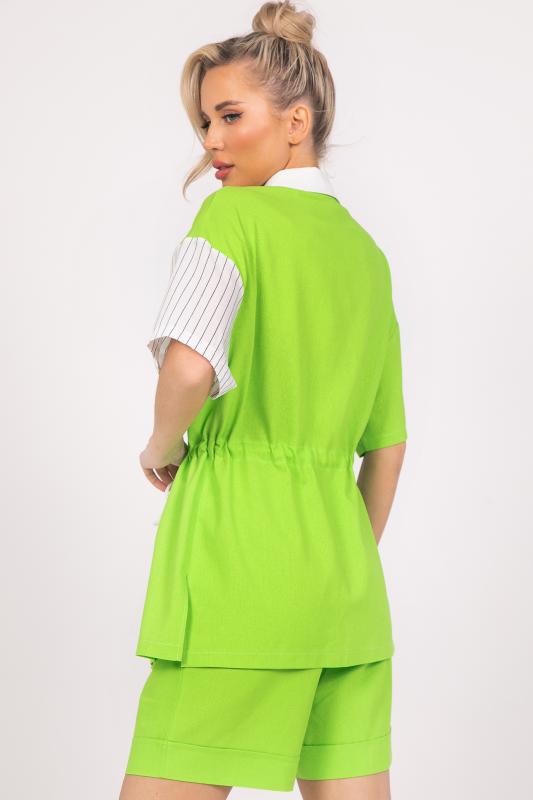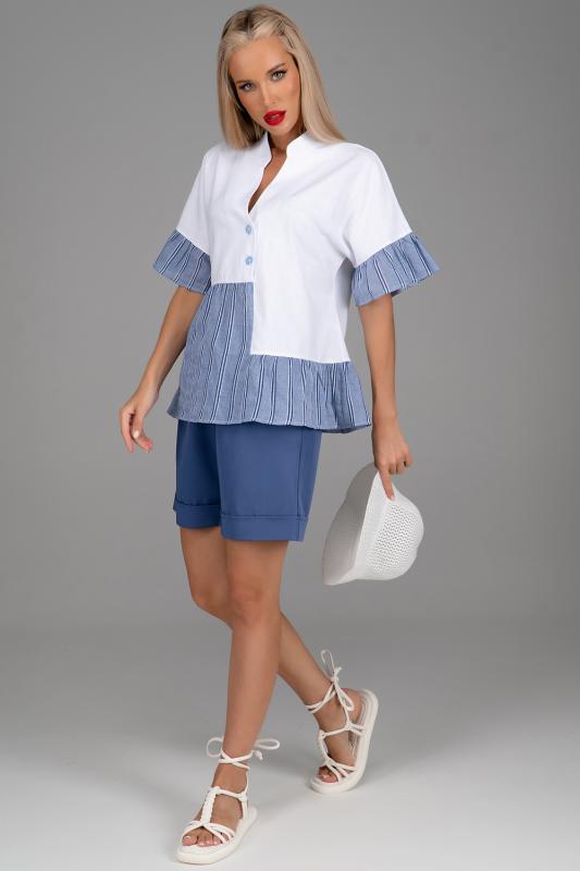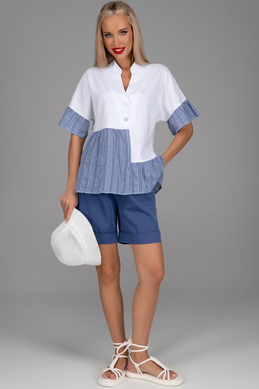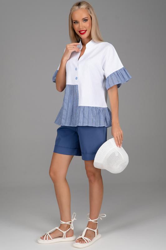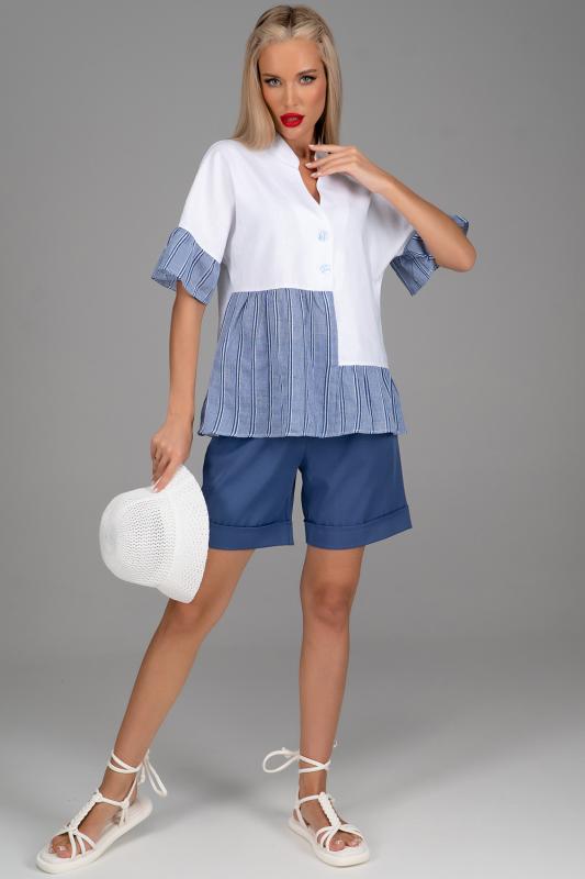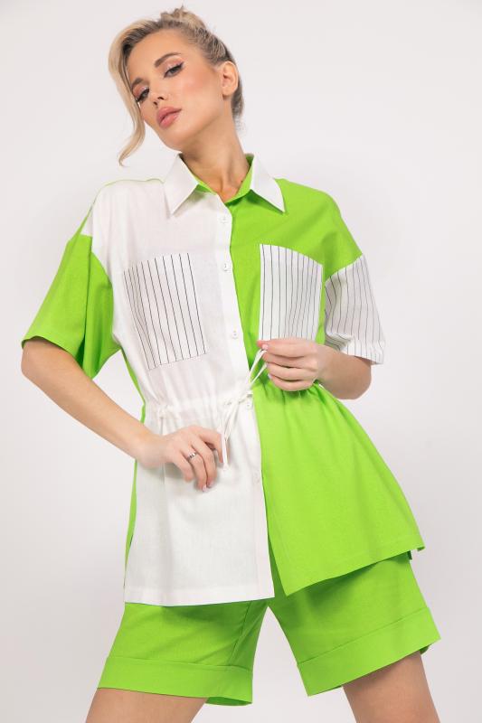 Комплект состоит из шорт и рубашки на кулиске, шорты на резинке, функциональные карманы. Рубашка свободного кроя спущенное плечо, планка на пуговицах, ворот на стойке отложной.