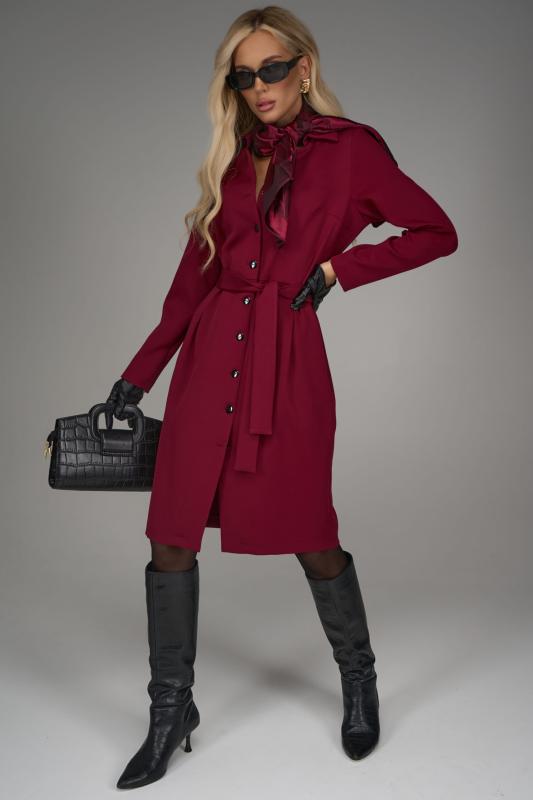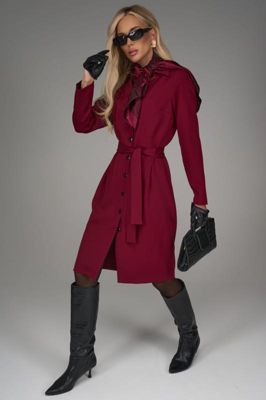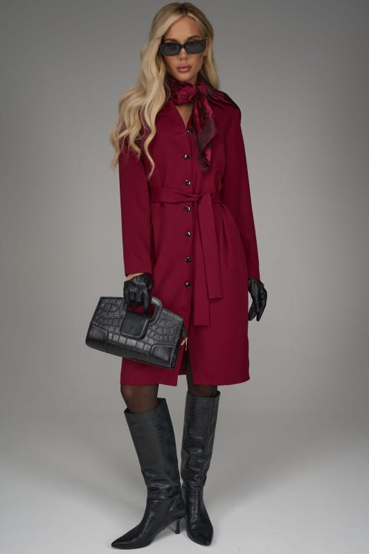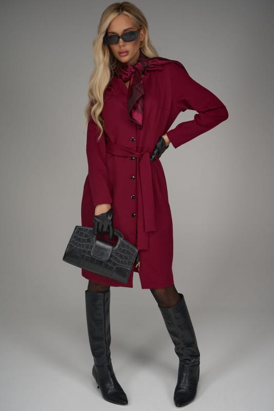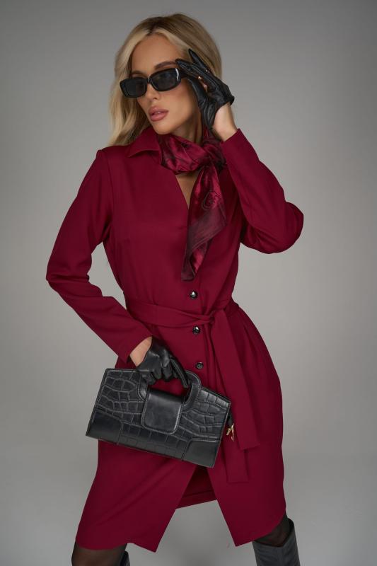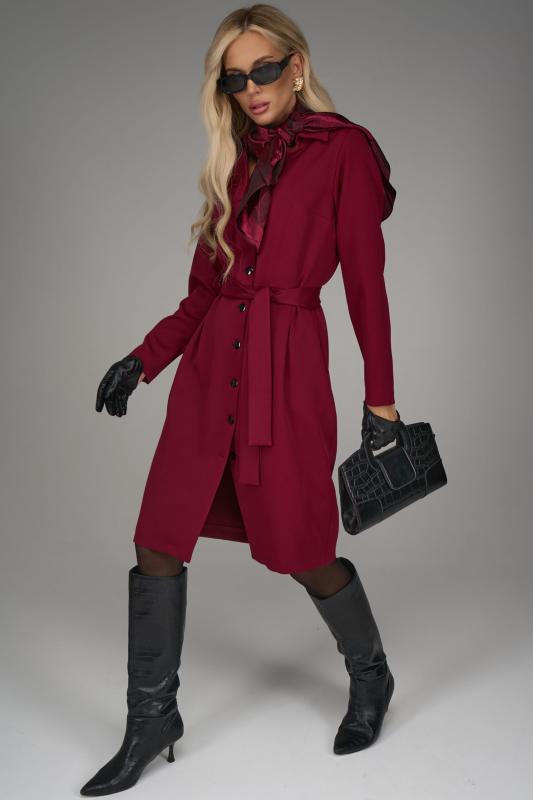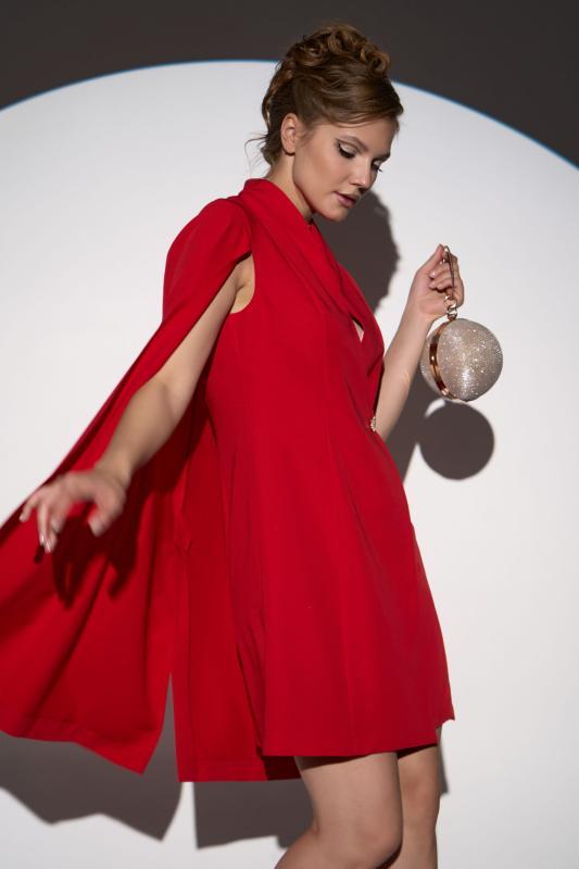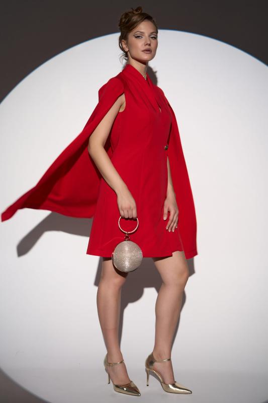Платье «Мариона» сочетает в себе силуэт строгого жакета и лёгкость вечернего одеяния, идеальный выбор для тех, кто хочет блистать на праздничном вечере. Материал: костюмная ткань средней плотности Воротник и вырез: узкий стойковый элемент с аккуратным V-углублением по центру — вырез сдержанно открывает шею, не нарушая строгой линии. Накидка: основная характерная деталь — длинные летящие панели-накидки, прикреплённые по линии плеч, с продольными разрезами, в которых видны руки. Эти «летящие» панели создают эффект плаща: движение, лёгкость и театральность, сохраняя при этом структурированную линию плеч. Силуэт: приталенный прямой корпус-платье под накидкой, подчёркивающий талию и создающий контраст между структурой лифа и мягкой драпировкой накидки. Длина: мини — уравновешивается объёмной накидкой, поэтому образ выглядит празднично, но сбалансированно. Ткань и цвет: насыщенный красный оттенок