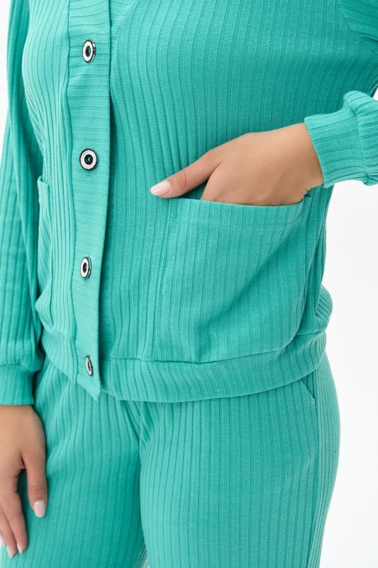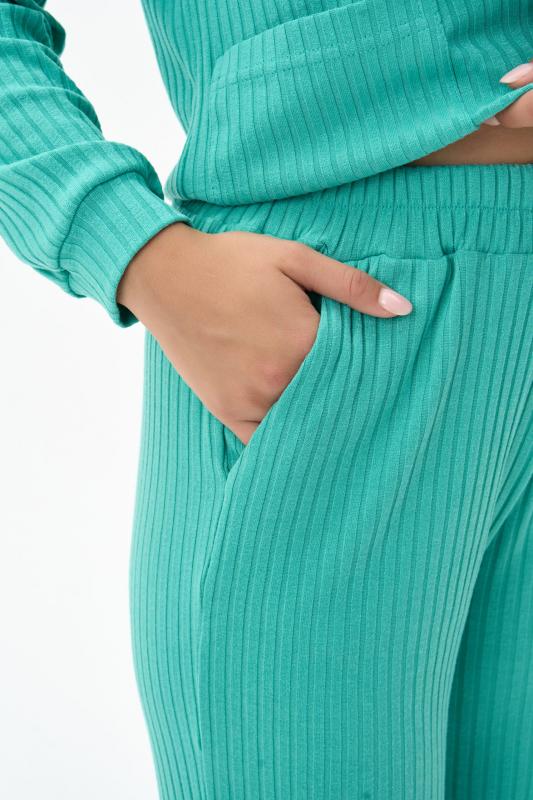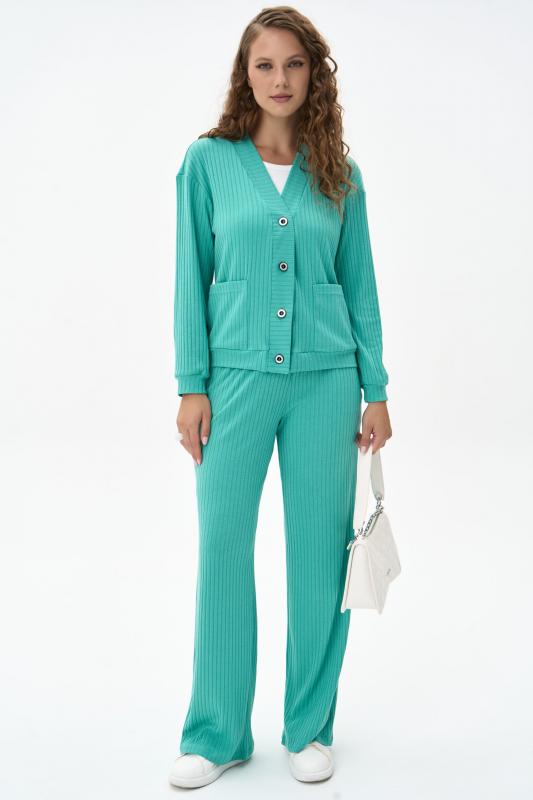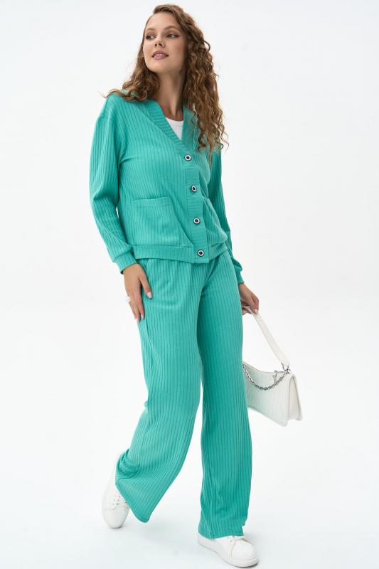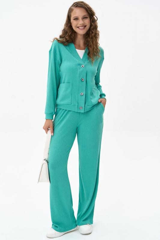 Модный брючный костюм из трикотажа “лапша” прекрасно подойдет на осенний и зимний сезон. Состоит из модного бомбера с широкими штанами. талия у брюк на резинке, карманы. Бомбер с планкой на пуговицах, накладные карманы. Материал: трикотаж Принт: отсутствует Вид застежки: пуговицы Карманы: есть Резинка в поясе: есть Силуэт: свободный Длина верха: 46-48р -57 см, 50-52р – 59 см Длина брюк: 46-48р – 105, 50-52р – 107 см Размер изделия на модели: 46 Рост модели: 172 см