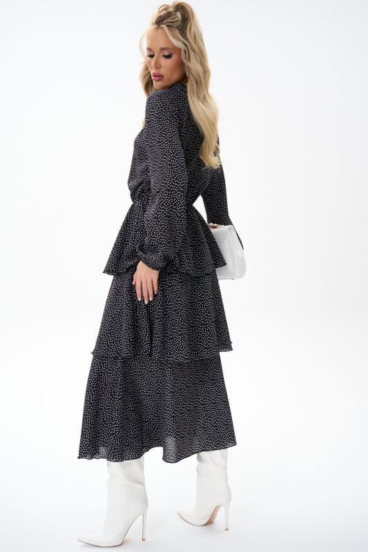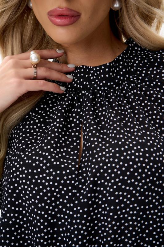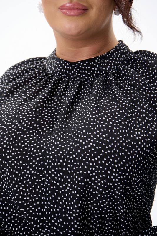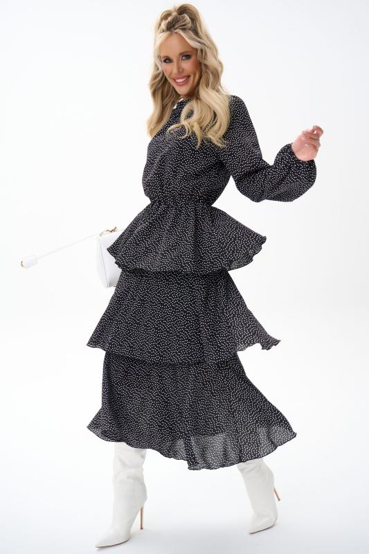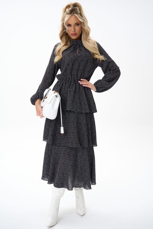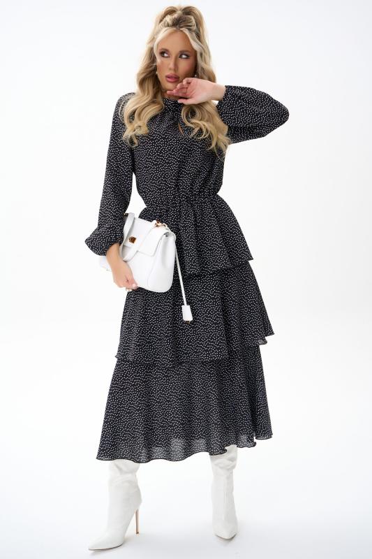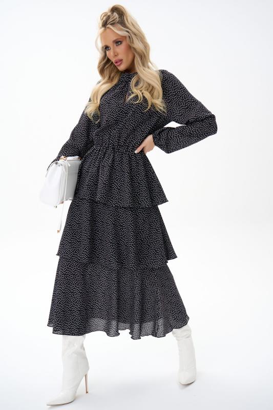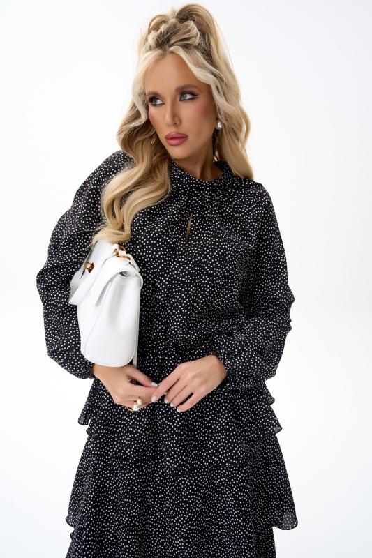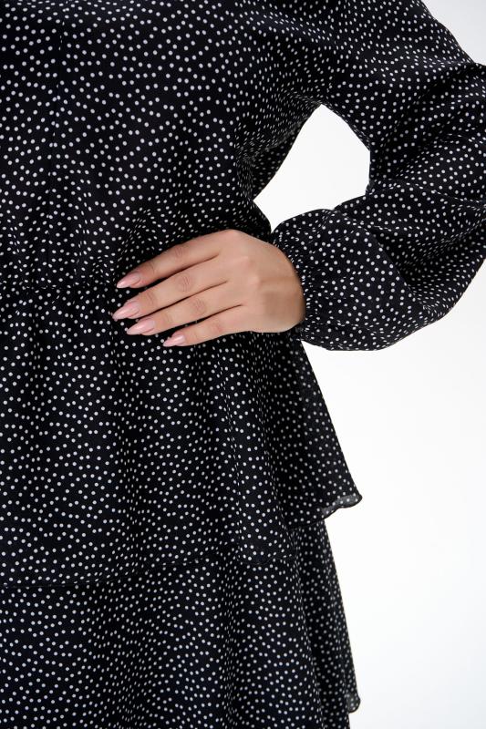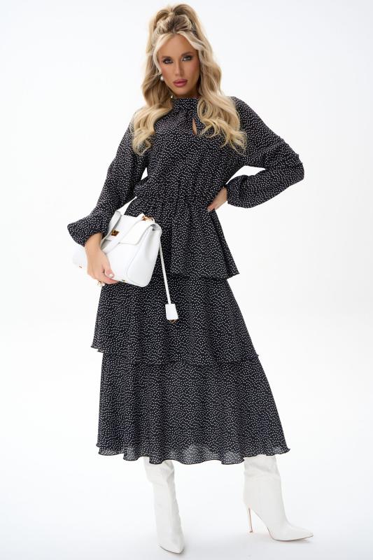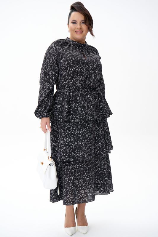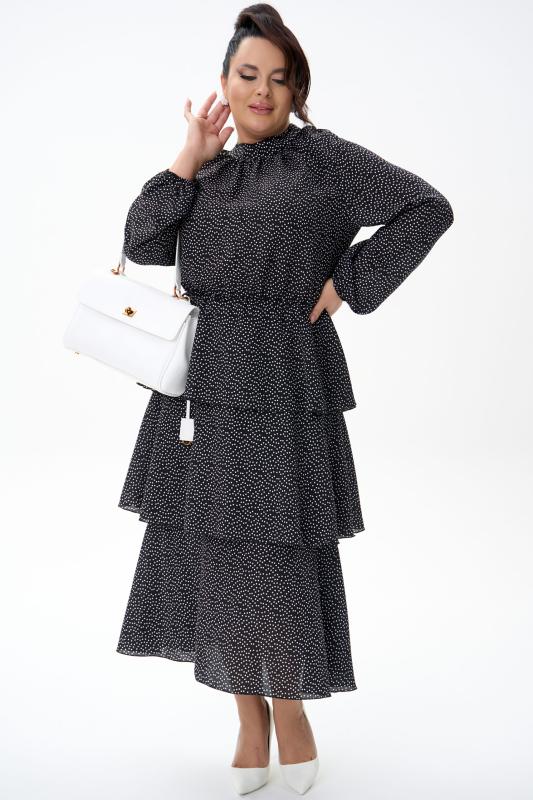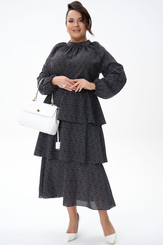 Лаконичное миди-платье из воздушного шифона — идеальный выбор для деловых и повседневных образов. Элегантный мелкий горох на тёмном фоне, высокая собранная горловина и многоярусная юбка создают женственный силуэт, который мягко скрывает проблемные зоны и подчёркивает талию. Носится с лодочками и строгой сумкой днём, с аксессуарами — вечером. Длины: ( 44р-122 см,46р-123 см,48р-124 см,50р-125 см,52р-126 см,54р-127 см). Силуэт: свободный в верхней части + подчеркнутая талия Длина: миди Рукав: длинный, со сборкой в плечевой части и мягким манжетом. Горловина: стойка с мелкой сборкой (не слишком высокая, декоративная). Принт: мелкий горох по всей поверхности. Материал: шифон