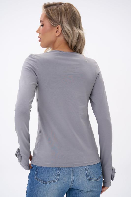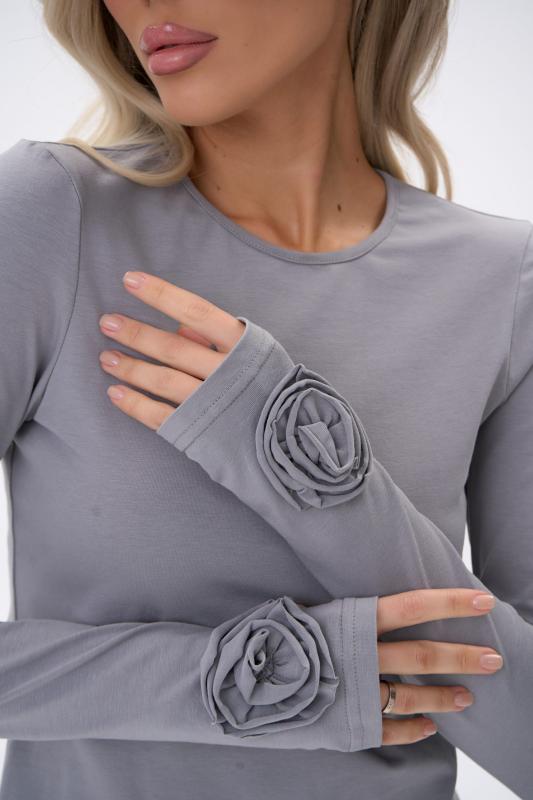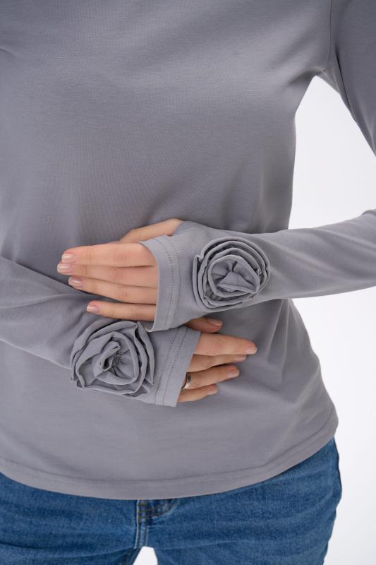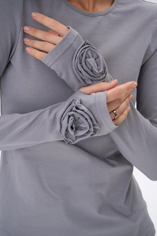 почти не мнётся и не скатывается. Крой: полуприлегающий, подчёркивает фигуру, не стесняя движений. Длина: до линии бедра — универсальна для носки навыпуск или заправленной. Рукава: длинные, классической посадки. Горловина: круглый вырез с аккуратной обработкой. Детали: Длинные рукава с отверстием для пальца, декоративная розочка на ладони Размер изделия на модели: 44 Рост модели: 172 см Параметры модели: 88-63-96 Длины: 44-52 р- 65 см, рукав 60 см