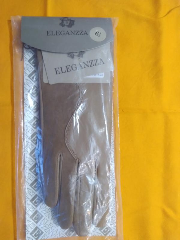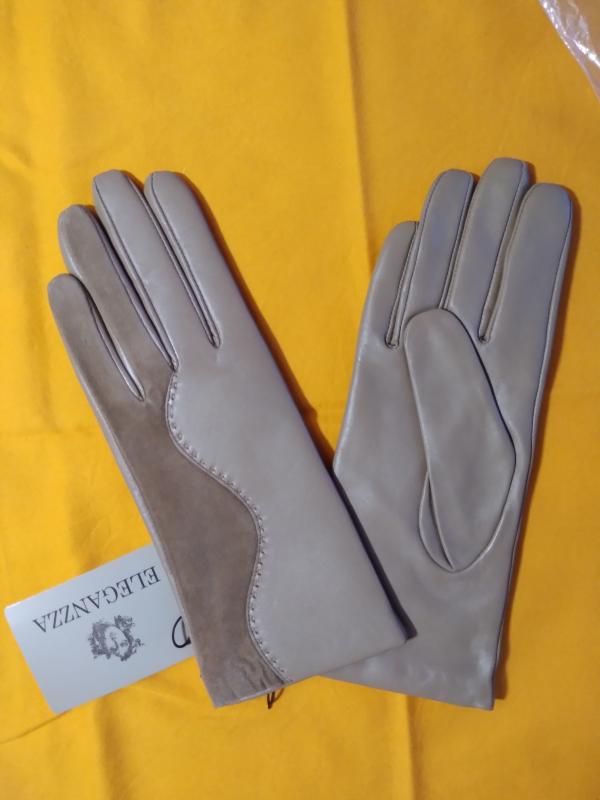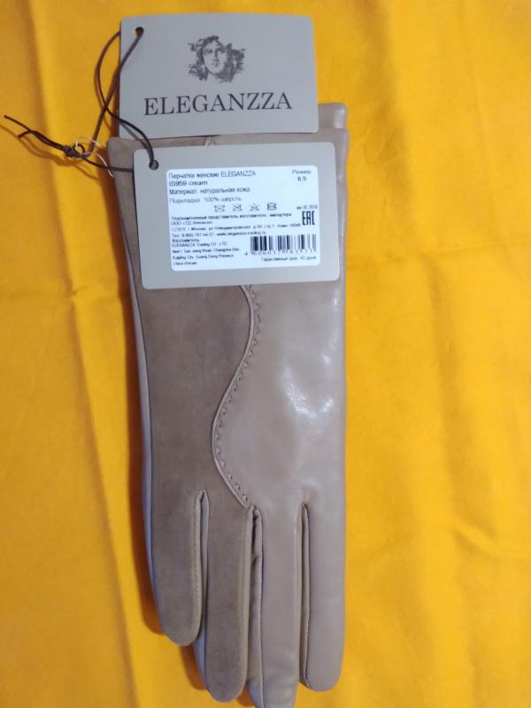 Перчатки женские торговой марки ELEGANZZA производства Китай. Выполнены из натуральной кожи ягненка. Подкладка - 100% шерсть. Отделка - декоративная строчка, комбинирование натуральной кожи с велюром. Длина манжеты от нижней точки большого пальца до края перчаток - 5,5 см. Длина пальцев - средняя.