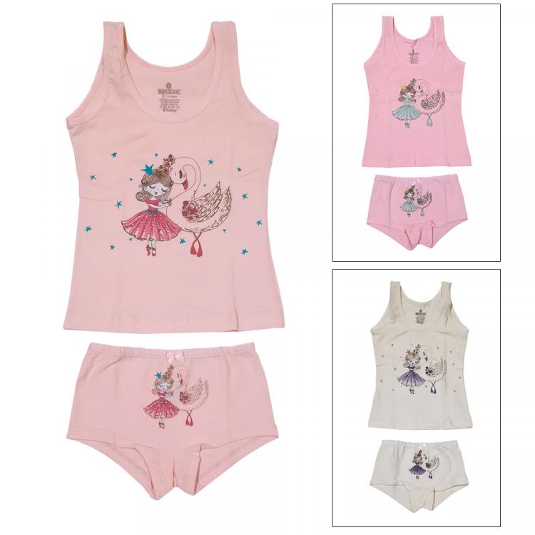 , украшенном стразами. Горловина и проймы майки отделаны трикотажным кантом. Размер 2 (110-116), длина- 42 см, обхват груди- 55 см. Размер 3 (122-128), длина- 46 см, обхват груди- 60 см. Размер 4 (134-140), длина- 47 см, обхват груди- 64 см. Размер 5 (146-152), длина- 51 см, обхват груди- 66 см. Замеры выборочные, могут незначительно отличаться. Трусики-шортики на закрытой резинке в поясе. Проймы с подворотом. Украшены атласным бантиком. ВНИМАНИЕ! Расцветка может прийти любая, из представленных на фото.