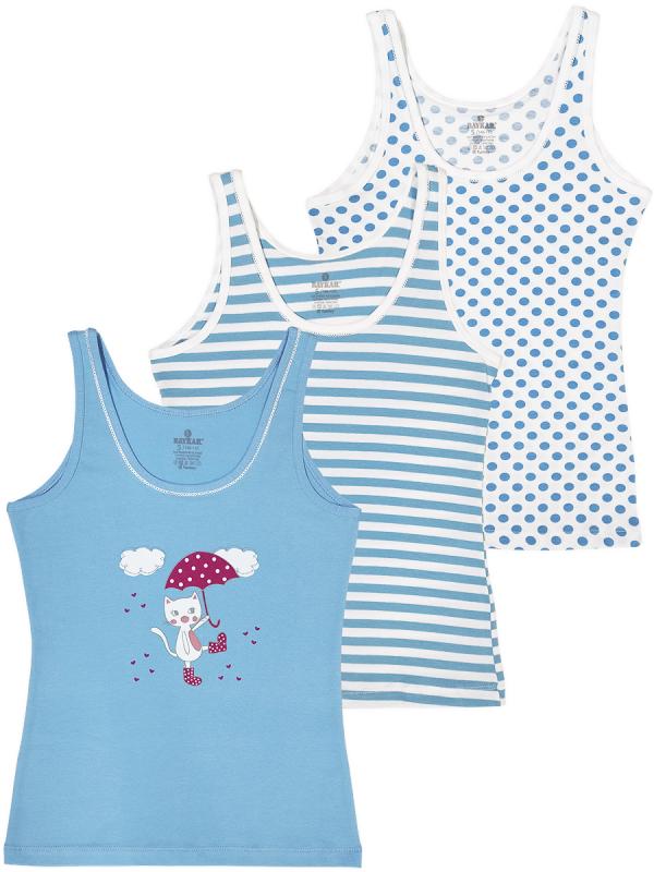 ). Модель приталенного кроя. Выполнена из эластичного х-б трикотажа кулирное полотно. Отделка выреза и пройм из эластичного трикотажного канта в тон полотна. Низ изделия подвернут и прошит двойной строчкой. Размер 1 (98-104): длина - 40 см, обхват груди - 53 см. Размер 2 (110-116): длина - 42 см, обхват груди - 56 см. Размер 3 (122-128): длина - 44 см, обхват груди - 60 см. Замеры выборочные, могут незначительно отличаться. Товар продается набором 3 шт.