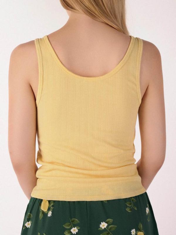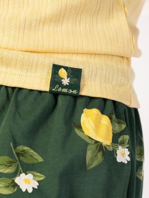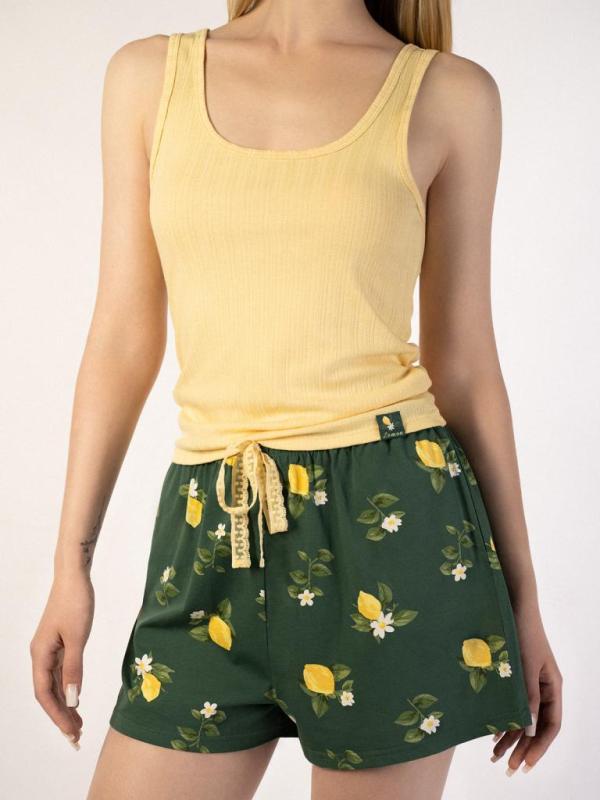 Легкая и стильная пижама для комфортного сна и отдыха. Сочетание дышащих материалов и яркого летнего дизайна с лимонами создает настроение свежести и уюта. Идеально подходит для теплых летних ночей. Майка: — Состав: полиэстер-вискоза-эластан — дышащая ткань с легким растяжением — Нежный желтый цвет майки в ажурный рубчик — Мягкая эластичная ткань, приятная к телу Шорты: — Натуральный 100% хлопок — Регулируемый пояс с кружевной лентой — Мягкая широкая резинка для комфортной посадки — Свободный крой, не стесняющий движений