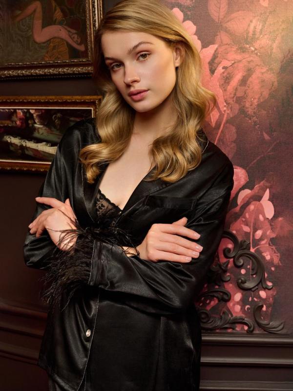 Элегантная и практичная пижама изготовлена из смеси вискозы и полиэстера — мягкая, но износостойкая. В комплекте жакет с пуговицами и брюки прямого кроя. Дизайн лаконичный: чёрный цвет, перья на рукавах жакета.