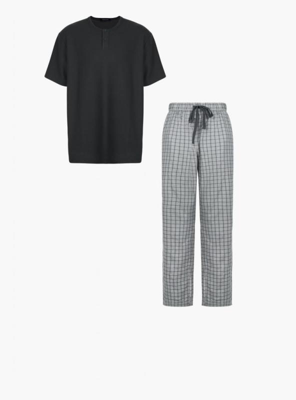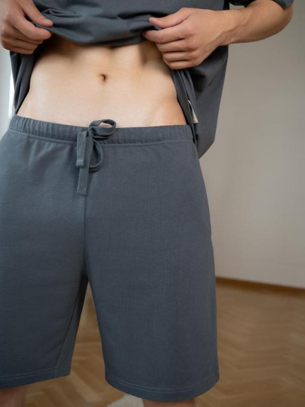 Мужская пижама Indefini выполнена в универсальном тёмно-сером цвете. Комплект состоит из классической футболки с коротким рукавом и круглым вырезом, а также свободных шорт на мягкой эластичной резинке с регулируемым шнурком и боковыми карманами.