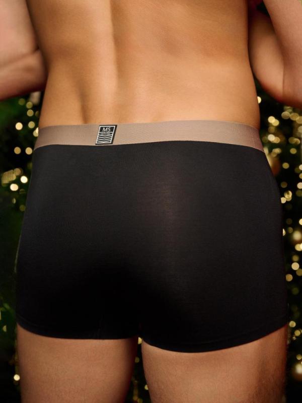 Мужские трусы-боксеры 5124MUG выполнены в классическом чёрном цвете. Модель изготовлена из модала с добавлением эластана. Отличается удобной посадкой: эластичный пояс бежевого цвета надёжно фиксирует бельё на талии, не сдавливает. Классический крой не сковывает движения — подходит для повседневной носки.