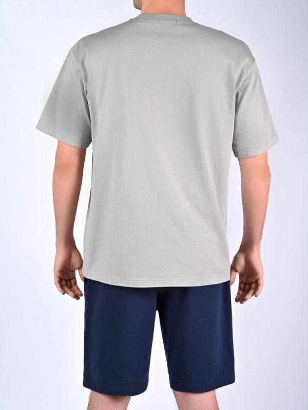 Мужская пижама торговой марки Indefini. Комплект состоит из светло-серой футболки с оригинальным принтом медведя и надписью "