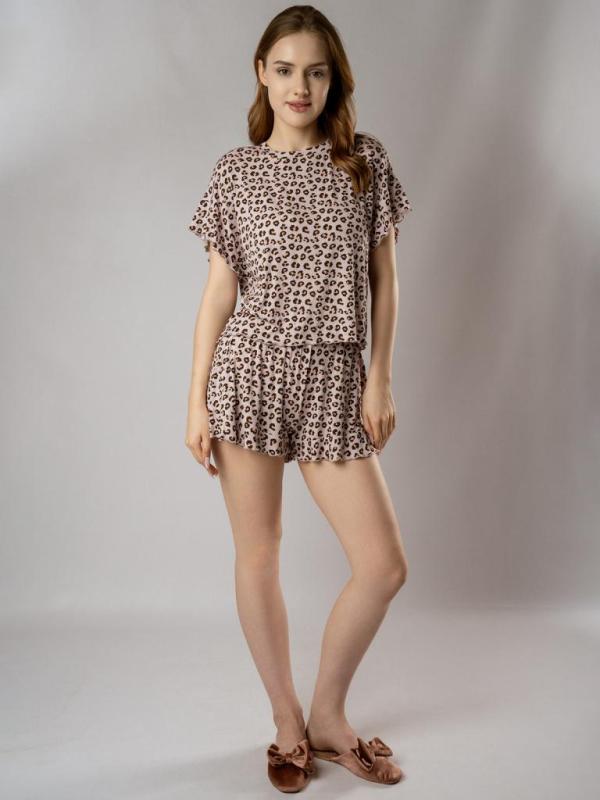 Пижама из нежной вискозы с фактурой в рубчик окутывает вас, как облако — настолько легкой и приятной кажется ткань. Футболка с выразительными плечами подчеркивает силуэт, а шорты идеально сидят на талии, даря полную свободу движений. Приглушенный леопардовый принт добавляет изюминку, не перегружая образ.