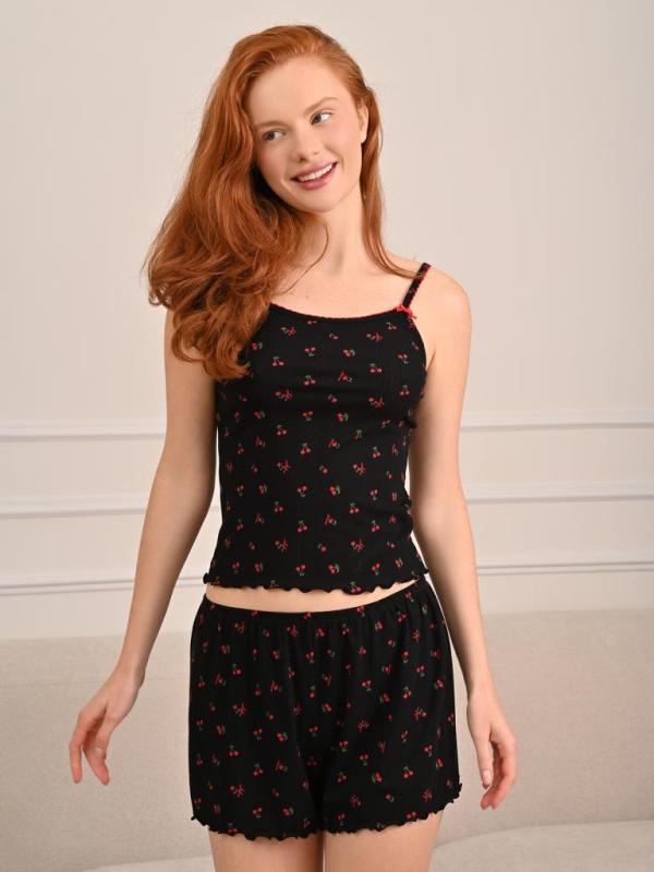 Женская пижама сшита из ажурной хлопковой ткани с добавлением бамбука. Украшена принтом и имеет перформацию — так кожа лучше «дышит», ткань ощущается более легкой и приятной в жаркую погоду. Майка облегает и подчеркивает фигуру. Посадка майки регулируется несъемными лямками, регулируемыми по длине. Шорты свободного кроя. Поэтому в пижаме удобно и спать, и отдыхать дома.