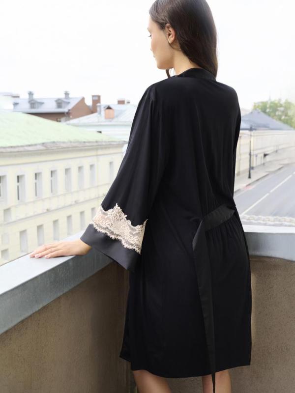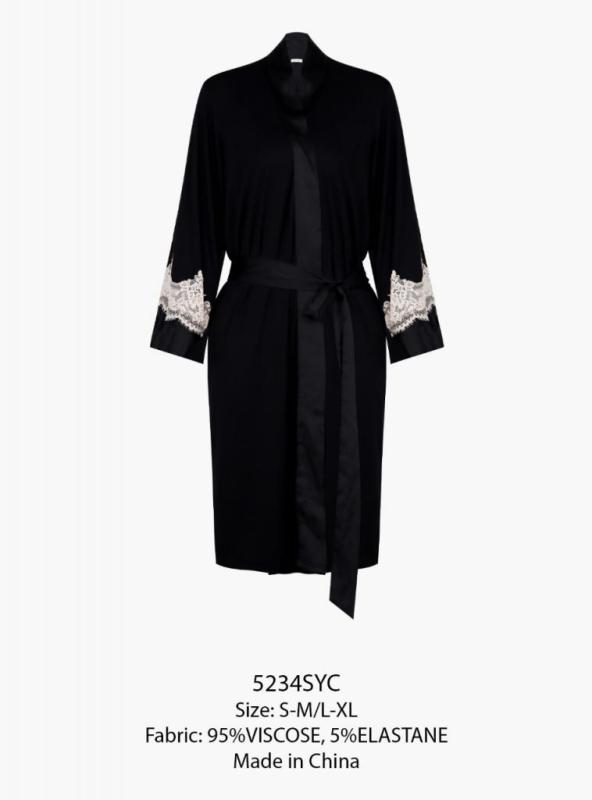 Халат сшит из мягкой вискозы, которая дарит коже приятные ощущения. Халат мягкий и гладкий на ощупь. Его удобно носить как поверх пижамы, так и на голое тело. Рукава украшены кружевом цвета шампанского. Вставки мягкие на ощупь и не колются. Съемный пояс выполнен из той же вискозы, продет в шлевки по бокам и завязывается спереди узлом или бантом. Идеально сочетается с пижамой. Состав : 95% вискоза, 5% эластан