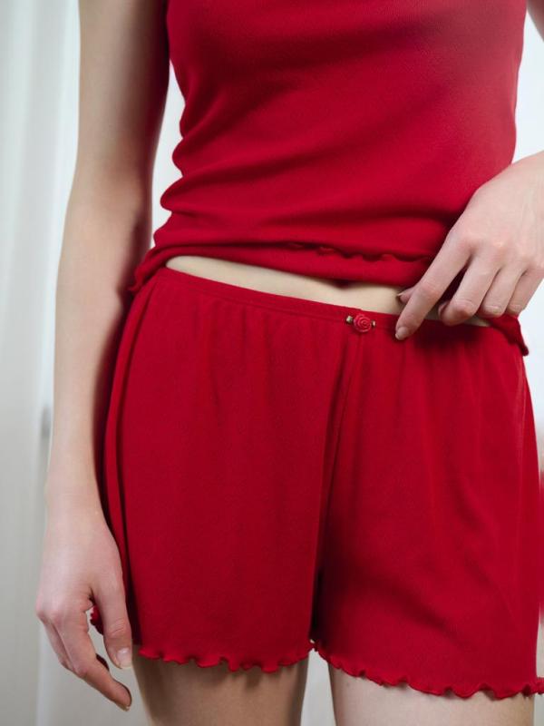 Пижама женская изготовлена из полиэстера с добавлением хлопка и вискозы. В комплекте майка с шортами. Майка на тонких регулируемых бретелях имеет декоративный элемент в зоне декольте. Шорты с аналогичным декоративным элементом держатся на талии тонкой эластичной резинкой.