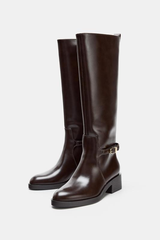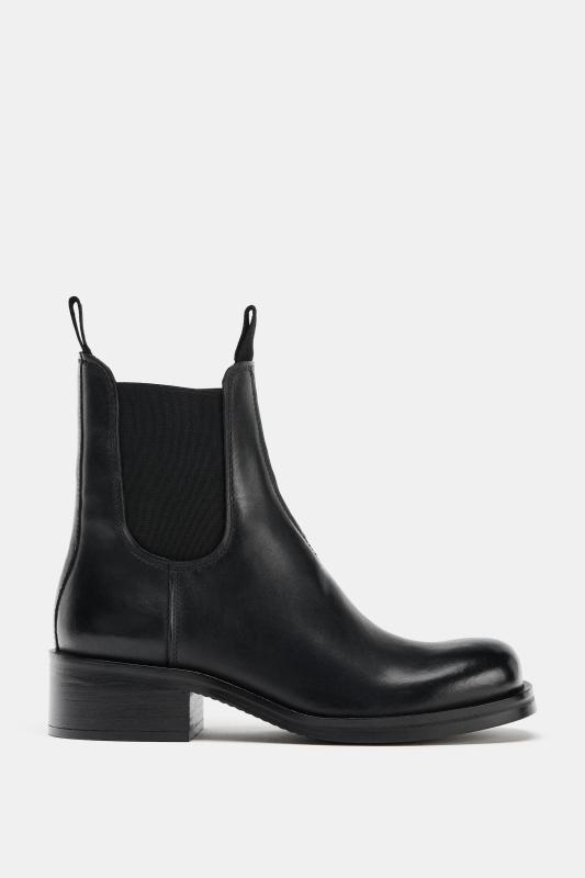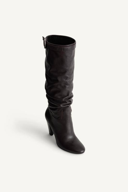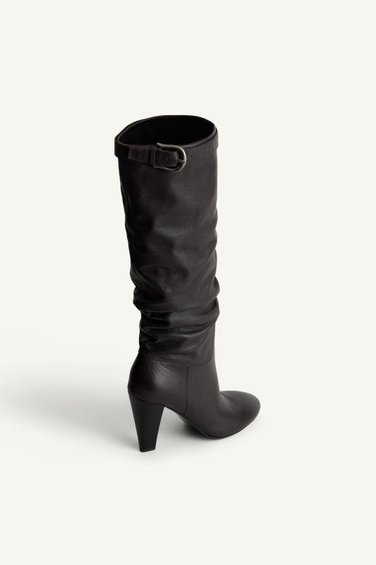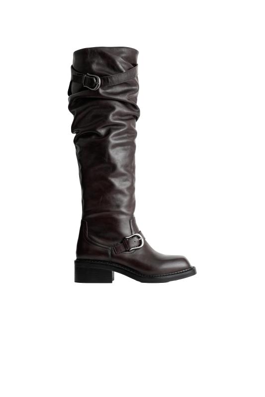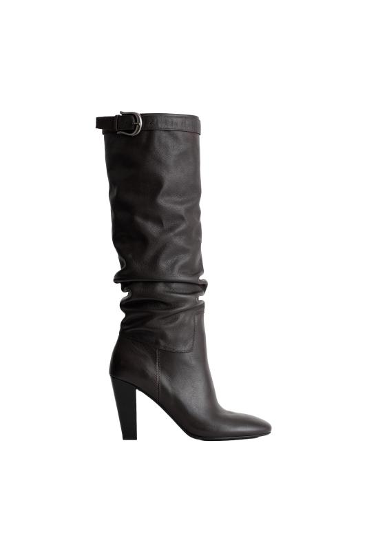 Обувь типа ботинок. Деталь с металлической пряжкой на хвостовике. Каблук средней ширины. Высокий тростник. Легкая посадка с помощью выдвижного и заднего рычага. Отделка с круглым носком.