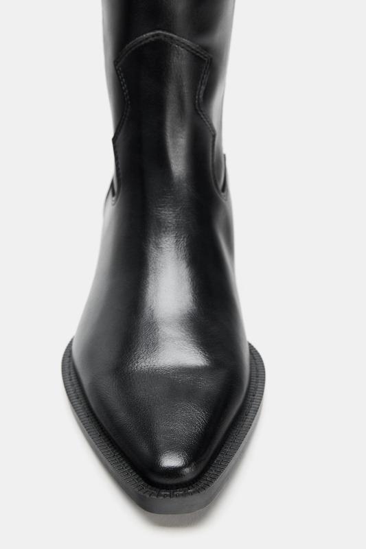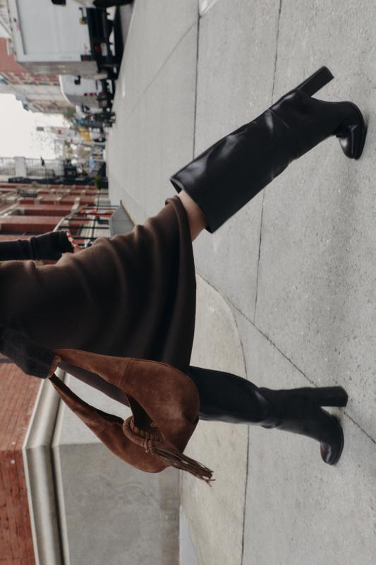 Обувь типа ботинок с широким высоким голенищем. Стежок с изнаночной стороны на теле контрастный. Каблук котенка. Легко надевается с помощью pull on. Остроконечная отделка.
