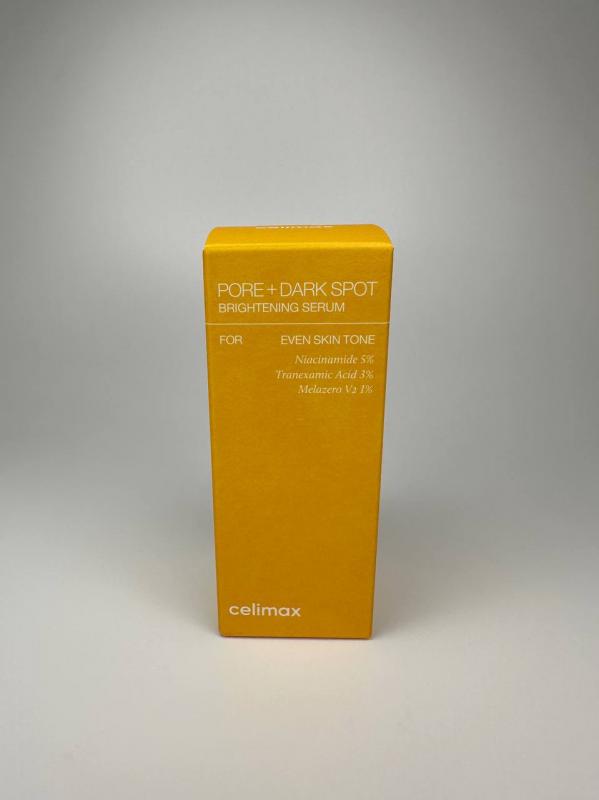 Сыворотка Pore+Dark Spot Brightening Serum от популярного корейского бренда Celimax мягко осветляет пигментацию и постакне, улучшает общий тон, устраняет тусклость и дарит здоровое сияние. Уровень pH 5.9-7.9. Выравнивает текстуру кожи, сужает расширенные поры, сглаживает микрорельеф и осветляет сальные нити. Имеет плотную текстуру, не оставляет липкости, приятно освежает при нанесении. Не провоцирует сухости и раздражения, не содержит ароматизаторов.