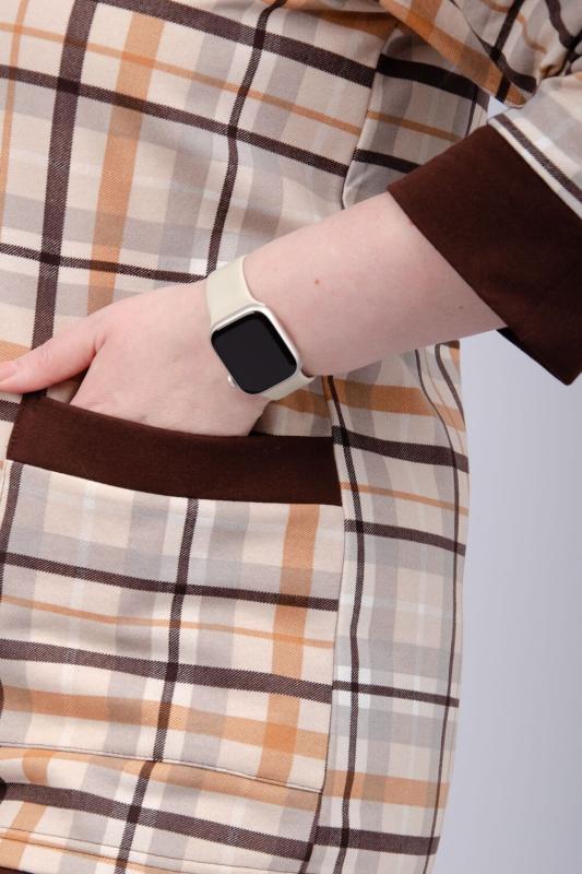 обработана обтачкой, спущенная пройма, рукав 3-4. Спинка присборена на кокетке , что придаёт фасону некую изюминку, в боковых швах удобные карманы. Неотъемлемая часть гардероба - платье миди, которое визуально делает фигуру более стройной, которое сочетает в себе женственность, стиль, удобство, сексуальность. Длина рукава в таблице измерений указана от начала горловины.