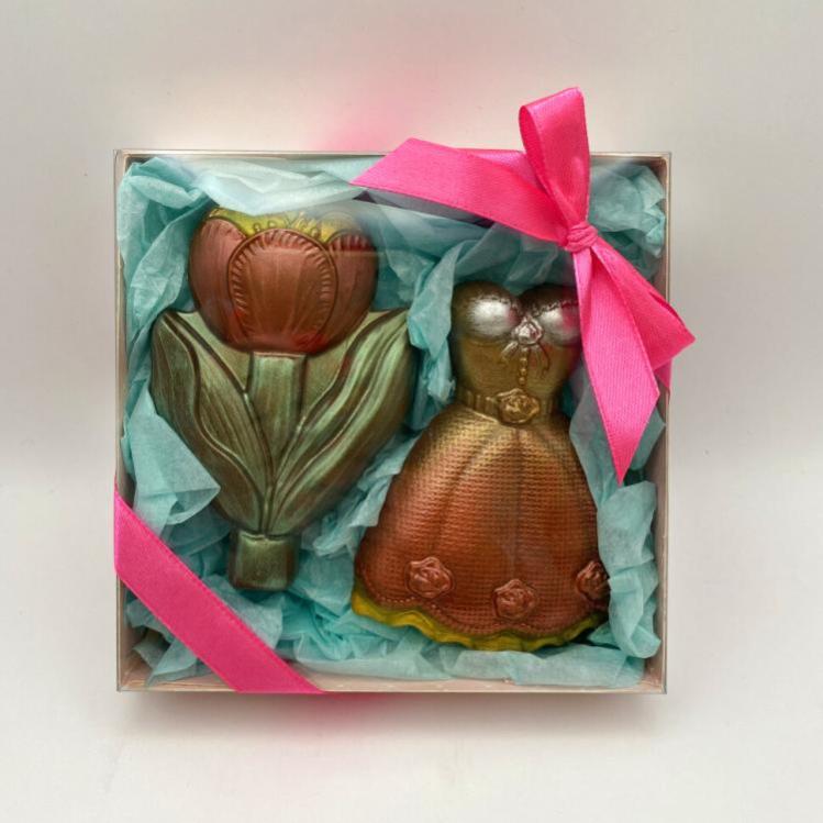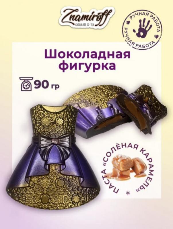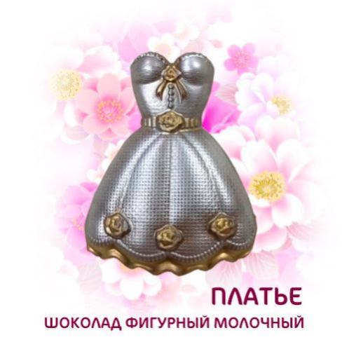 Фигурный шоколад, выполненный в форме платья из струящейся ткани. Стильный фасон и нежный вкус молочного шоколада с добавлением натуральной ванили и какао порадуют девушек-сладкоежек. Порадуйте свою подругу стильным съедобным нарядом!